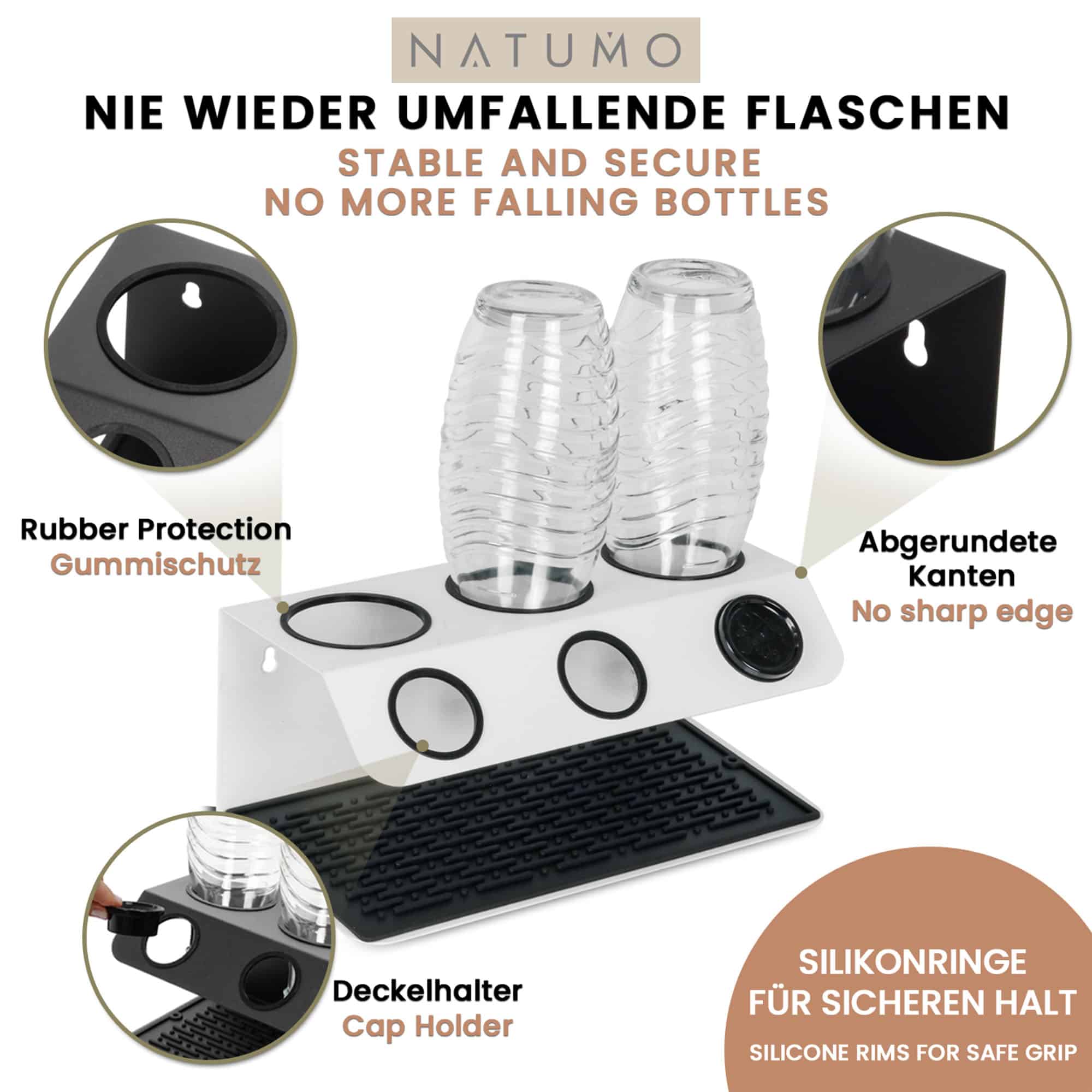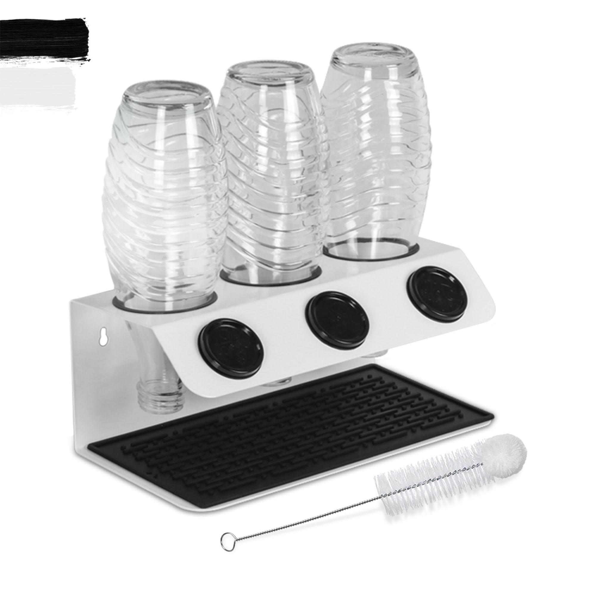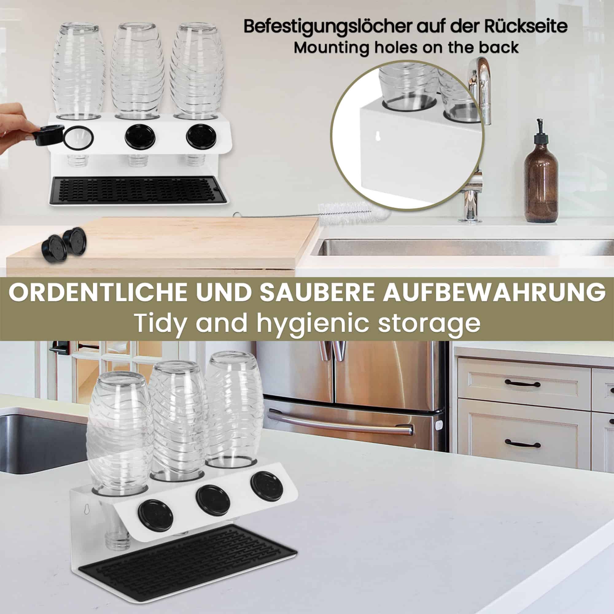 UNIVERSELL EINSETZBAR: Die Flaschen- und Deckelhalterung ist für alle SodaStream Flaschen (Crystal, Easy, Fuse & Emil) geeignet, sowie für weitere Glas- und Kunststoffflaschen ähnlicher Größe.