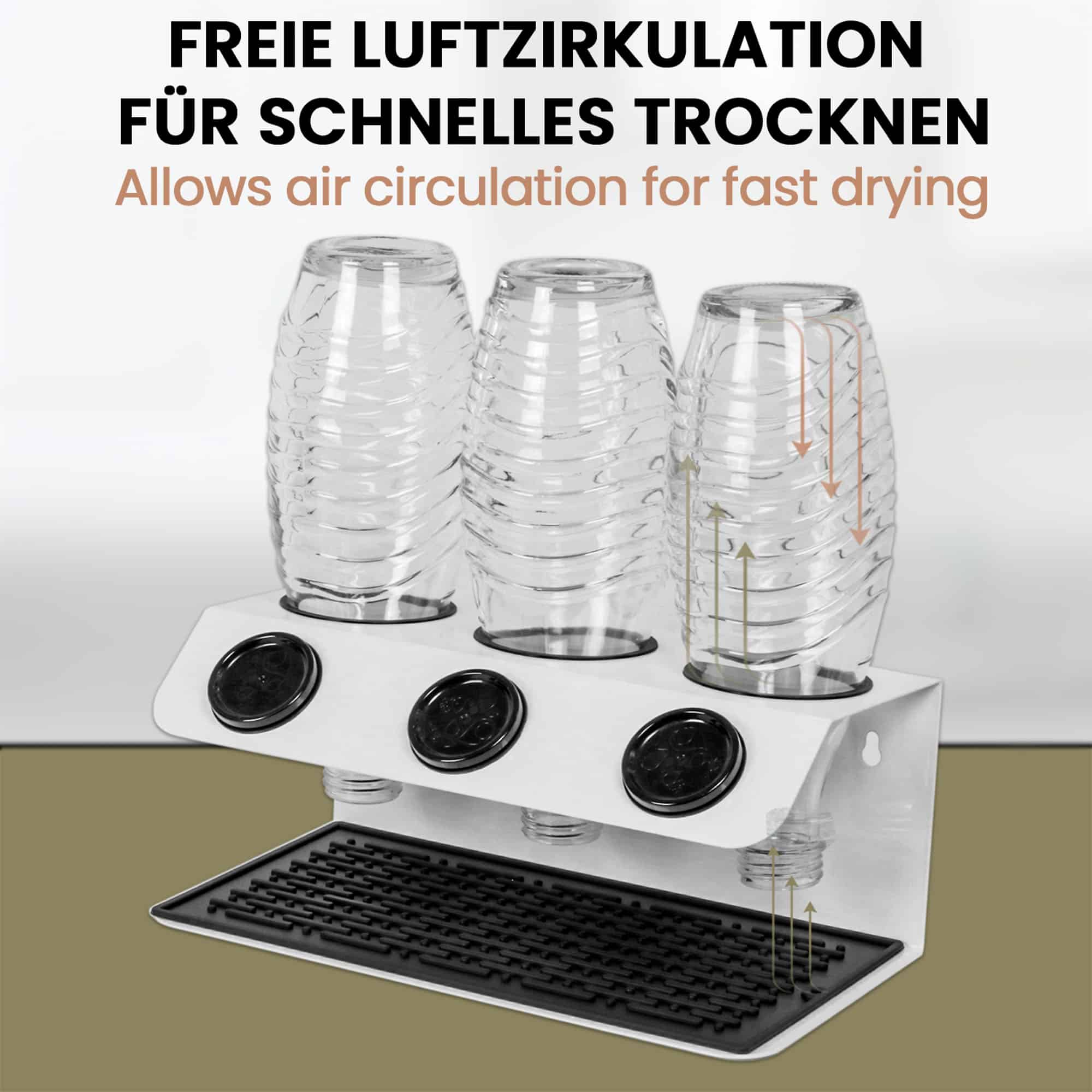 SCHNELL & HYGIENISCH TROCKEN: Nie wieder umfallende Glasflaschen und kein Restwasser am Flaschenboden! Platziere gespülte Karaffen und Deckel in der Flaschenhalterung für maximale Luftzirkulation. Deine Flaschen waren noch nie so schnell und rückstandslos trocken!