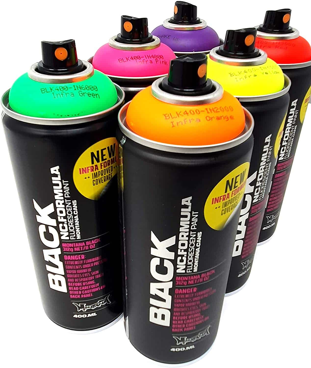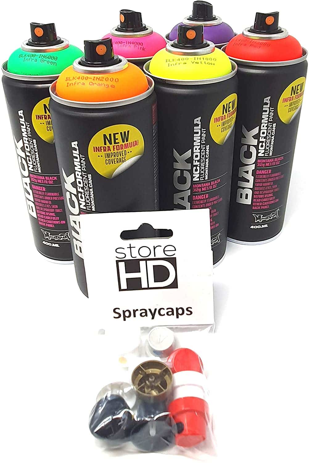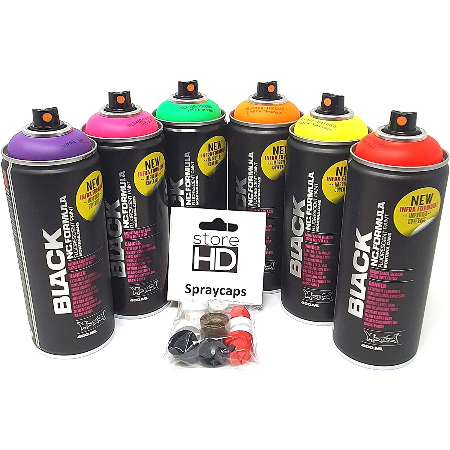 Montana Black Infra Sprühdosen Set Neon Farben + Ersatzsprühköpfe – 6 x 400ml